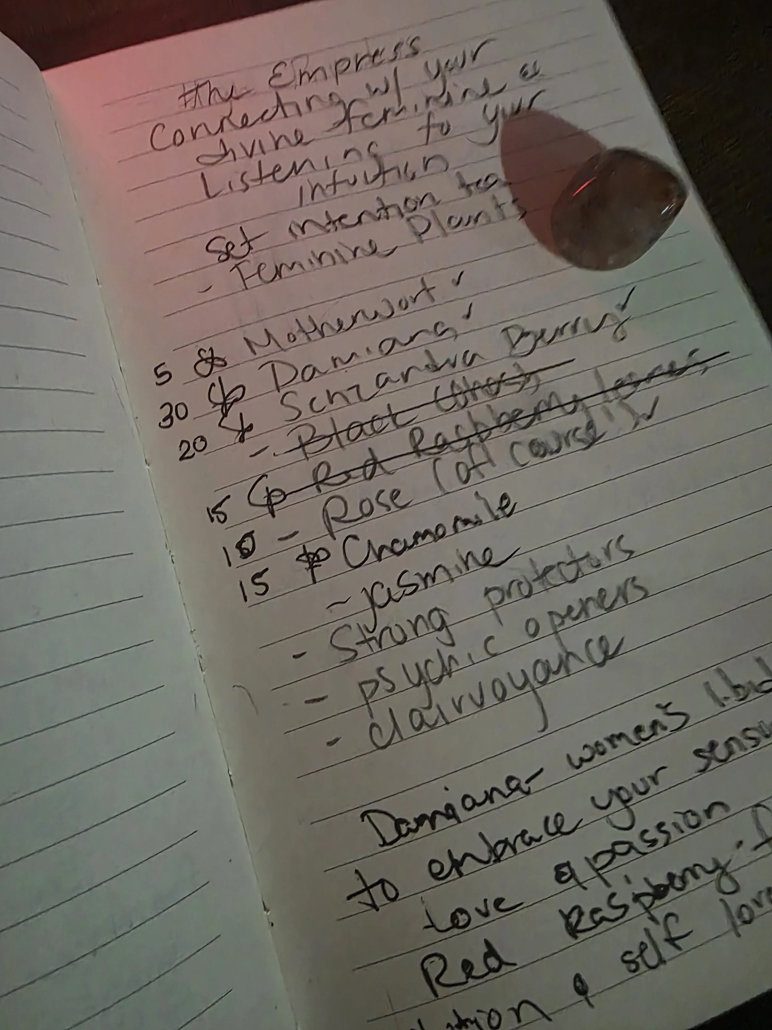 I then write down a bunch of herbs that I connect with femininity and are known to be helpful specifically for women. Pictured are my first notes with the list of herbs. Some crossed out, some not. Some added later.